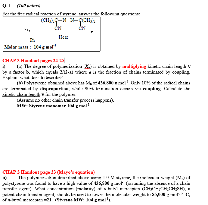 Q 1 100 Points For The Free Radical Reaction Of Chegg Com